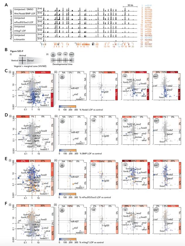 Figure S2. Effect of Canonical Wnt, Nodal and BMP Signals on ZGA, Related to Figure 2. (A) Poly(A) RNA profiles of the C2H2 ZF cluster (Figure S1H) for indicated control and LOFs at the MBT. (B) Graphical explanations of figure panels (C-F). (C-F) Summary (i) and temporal resolution (ii) of gene mis-regulations upon the LOF of Nodal (C) or BMP (D) signaling or maternal Pou5f3/Sox3 (mPou5f3/Sox3) (E) or VegT (mVegT) (F). Percentages only refer to the down-regulated genes (by â¥1/3 compared to control expression level) among all zygotic genes with the same range of expression ratios along the animal-vegetal or the dorso-ventral axes. |