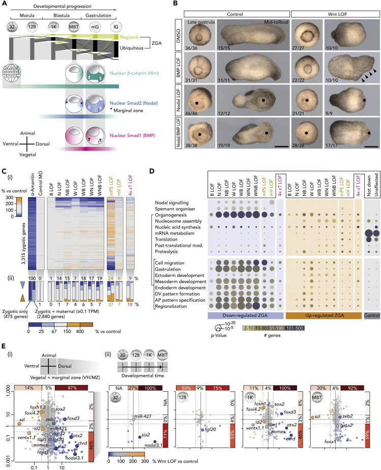 Figure 2. Spatiotemporal ZGA Regulated by Canonical Wnt, Nodal, and BMP Signals(A) Spatiotemporal ZGA and nuclear localization of signal mediators β-catenin (canonical Wnt), Smad2 (Nodal), and Smad1 (BMP) (Faure et al., 2000, Larabell et al., 1997, Schohl and Fagotto, 2002) from the 32-cell to the late gastrula stage.(B) Morphological phenotypes of single and combined signal LOFs at the late gastrula and the mid-tail bud stage. Left (âcontrolâ) pictures are taken from Gentsch et al. (2018b). Bullet points, failed blastopore formation. Arrowheads, excessive neural fold formation. Scale bar, 0.5 mm.(C) Heatmap (i) and bar graph summary (ii) of ZGA mis-regulated in various LOF embryos: α-amanitin, positive control; control MO, negative control. Abbreviations: B, BMP; N, Nodal; W, canonical Wnt; mPS, maternal Pou5f3/Sox3; mV, maternal VegT; 4x zT, four zygotic T-box TFs (zygotic VegT, Eomes, Tbxt and Tbxt.2).(D) Biological processes enriched with mis-regulated and control (not down-regulated or unaffected by the loss of maternal TFs or signaling) sets of zygotic genes under indicated LOFs. The statistical significance of enrichment (hypergeometric p-value) and the number of zygotic genes are visualized by bubble size and color, respectively.(E) Summary (i) and temporal resolution (ii) of Wnt LOF effects on regional ZGA. Percentages only refer to the down-regulated genes among all zygotic genes with similar expression ratios along the animal-vegetal or the dorsoventral axes.See also Figure S2, Tables S1 and S3, and Video S1. |