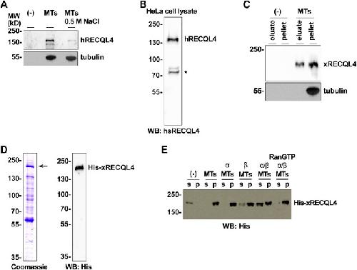 S1. RECQL4 is a RanGTP dependent MAP. (A) Endogenous human RECQL4 binds to microtubules (MTs) in a salt-sensitive manner. HeLa nuclear extract was incubated in the presence or absence of taxol-stabilized MTs and 0.5 M NaCl and centrifuged. MT pellets were immunoblotted using human RECQL4 and α-tubulin antibodies. (B) Preparation of human RECQL4 antibody. Recombinant human RECQL4 aa 1â831 was expressed in bacteria, purified, and used for antibody production in rabbits. The generated antibody detected endogenous hRECQL4 in HeLa cell lysate. *, nonspecific band. (C) Endogenous Xenopus RECQL4 binds to MTs. Xenopus CSF egg extract was incubated with taxol-stabilized MTs. MTs and MAPs were spun down. MAPs are eluted from MTs with high salt and separated by centrifugation. The eluate and MT pellet were immunoblotted. (D) Recombinant Xenopus RECQL4 expressed in insect cells and purified with TALON beads. Coomassie staining and Western blot (WB) using an anti-His 6-antibody are shown. (E) Xenopus RECQL4 binds to MTs in a RanGTP-regulated manner. Recombinant RECQL4 was incubated with MTs as in Fig 1B, but, where indicated, in the presence of recombinant importin α, importin β, and/or RanQ69L mutant loaded with GTP (RanGTP). After centrifugation, supernatant (s) and pellet (p) were analyzed by Western blot. |