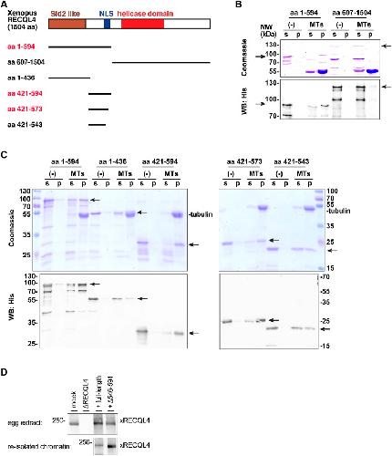 Figure S5. The NLS region of RECQL4 binds to microtubules. (A) Xenopus RECQL4 domain structures, and recombinant fragments expressed and purified. The proteins labeled in red bound strongly to microtubules (MTs), as shown in (B) and (C). (B) The N-terminal (aa 1â594) and C-terminal (aa 607â1,504) fragments of Xenopus RECQL4 were incubated in the absence or presence of MTs. After centrifugation, the supernatant (s) and pellet (p) were analyzed by Coomassie staining or Western blot (WB) against His6-tag. The respective fragments are indicated by arrows. (C) Different RECQL4 fragments in the N-terminal part of the protein were analyzed for MT interaction as in a (B). (D) Sperm chromatin was incubated with interphase RECQL4-depleted extract supplemented with mRNA encoding wild-type REQL4 or the deletion mutant (Î546â594). Chromatin was re-isolated by centrifugation and analyzed by immunoblotting (lower panel). To check for efficient translation of the added mRNA, control (mock), RECQL4-depleted (ÎRECQL4) extracts, and RECQL4-depleted supplemented with mRNAs are analyzed in the top panel. |