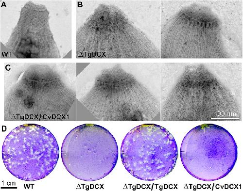 Fig. 10. CvDCX1 cannot rescue the structural and lytic cycle defects of the TgDCX knockout parasite. a-c EM images of the conoid region of negatively stained T. gondii. Parental RHΔku80Δhx (a, “WT”), TgDCX knockout (b, “ΔTgDCX”, two examples); a clone of TgDCX knockout parasite stably expressing CvDCX1-mNeonGreenFP under control of the T. gondii α-tubulin promoter (c, “ΔTgDCX/CvDCX1”, three examples). Compare with Fig. 6g and h. d Plaque assay (see Methods). Knockout parasites complemented with TgDCX-eGFP expressed under control of the T. gondii α-tubulin promoter (“ΔTgDCX/TgDCX”). Other annotations same as in a-c. Compare with Fig. 6i |