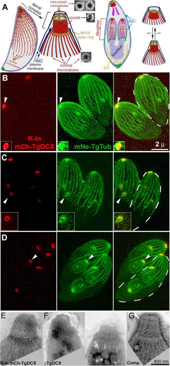 Fig. 1. Conoid architecture and endogenous TgDCX localization. a Diagrams of the T. gondii cytoskeleton [modified from [6]], in which several tubulin containing structures (22 cortical microtubules, 2 intra-conoid microtubules, and 14 conoid fibers) are highlighted in red. EM images of a cross-section of each of those polymers [5] are also shown. Shown in brown are several rings mentioned later in the text. The apical polar ring is the anchoring structure for the 22 cortical microtubules. A complex structure (the preconoidal rings, unlabeled), rich in intricate detail, lying at the apical end of the conoid, is portrayed in this cartoon as two featureless rings. IMC: Inner Membrane Complex. A replicating parasite is also shown, with daughter parasites being built inside the mother. The cortical microtubules of the adult are omitted for clarity. On the right, a cartoon shows how the conoid responds to increasing [Ca2+] by extending and changing its shape. (b-d) Z-projections of SIM images of mCherryFP-TgDCX (red, âK-in mCh-TgDCXâ) knock-in parasites [6] expressing mNeonGreenFP-β1-tubulin (green, mNe-TgTub). b Two interphase adult parasites. One adult is outlined with a dashed white border. The arrowhead indicates the apical complex of one parasite, shown 2x enlarged and contrast enhanced in the inset. Tubulin and TgDCX are co-localized in the conoid, appearing as an annulus with a ~â0.2âμm central opening. c Two dividing parasites at an early stage of daughter formation, with two daughters in each adult. One of the developing daughterâs apical complex is indicated by the arrowhead, and enlarged 1.5x in the inset. d Parasites at a later stage of daughter formation. The daughter apical complexes (white arrowhead) are nearly mature, and daughter cortical microtubules have grown to ~â1/3 of their length in the adult. e-g Electron microscope (EM) images of the conoid region of negatively stained whole-mount mCherryFP-TgDCX knock-in (e, âK-in mCh-TgDCXâ), TgDCX knockout (f, âÎTgDCXâ) parasites (two images), and a complemented line generated by transfecting the TgDCX knockout parasite with a plasmid driving expression of TgDCX-EGFP (g, âCompâ). The conoids are shorter, distorted, and disordered in the TgDCX knockout parasites (f) compared to their parental strain in (e), but supplying TgDCX completely restores conoid structure (g) |