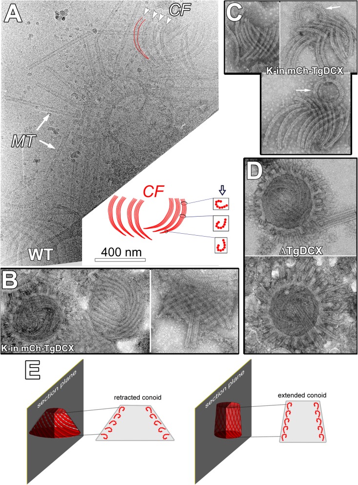 Fig. 2. Conoid diagram and EM images of conoids isolated from wild-type, mCherryFP-TgDCX knock-in and TgDCX knockout parasites. a CryoEM image of disassembled apical complexes from wild-type (âWTâ) parasites. Several groups of conoid fibers (âCFâ, arrowheads) and fragments of cortical microtubules (âMTâ, arrows) are seen. Note that the cortical microtubules are straight, whereas the conoid fibers are uniformly curved. The conoid fibers appear to become wider along their length, and their protofilaments become clearer, indicating a twist in the fibers, as diagrammed in the cartoon. The cartoon represents the cluster of fibers in the upper right of the cryoEM image. The hollow arrow in the cartoon shows the direction of view in the EM image, and the boxes contain cross-sections of the fiber at the indicated locations. Near the apical end of the fibers (towards the bottom in the cartoon and the image), the direction of view yields a narrow fiber with protofilaments obscured by superposition. As the fiber twists along its length, its profile becomes wider, and there is decreasing superposition of protofilaments, giving the splayed appearance at the basal region of the fibers. b End on (left) and side views (right) of negatively stained isolated conoids from mCherryFP-TgDCX knock-in parasites (âK-in mCh-TgDCXâ). In the left image, the apical polar ring with stumps of broken cortical microtubules encircles the conoid. A second conoid, almost completely disassembled, is also seen. In the right image, the two intra-conoid microtubules are seen projecting through the conoid, which is detached from the apical polar ring. c Three examples of disassembled conoids isolated from mCherryFP-TgDCX knock-in parasites (âK-in mCh-TgDCXâ). All 14 of the fibers that formed each conoid are seen. Arrows: preconoidal rings, which often remain attached to the apical ends of the fibers. d End on views of conoids isolated from TgDCX knockout parasites (âÎTgDCXâ). The conoids are encircled by the apical polar ring with attached fragments of cortical microtubules. Isolated conoid fibers or conoids detached from the apical polar ring were never observed in preparations from the TgDCX knockout parasite. e Diagram illustrating the changing geometry of the TgDCX-containing fibers of the conoid. Extension of the conoid through the apical polar ring, which occurs as the parasites reactivate motility and exit their lysed host cell, is accompanied by a change in conoid shape from more conical to more cylindrical. The structural implications, for the conoid fibers, that follow from this change in overall shape are described in the Discussion. For clarity, the change in fiber orientation has been exaggerated in the diagram. Note also that the diagrams here are oversimplified for clarity: in an untilted sagittal section as diagrammed, the fiber profiles cannot be clearly seen. In order to make the profiles visible, the section must be tilted in the microscope by plus (to see the profiles on one side) or minus (to see the profiles on the other side) the pitch angle of the fibers. See Fig. 6 in [5] for a demonstration |