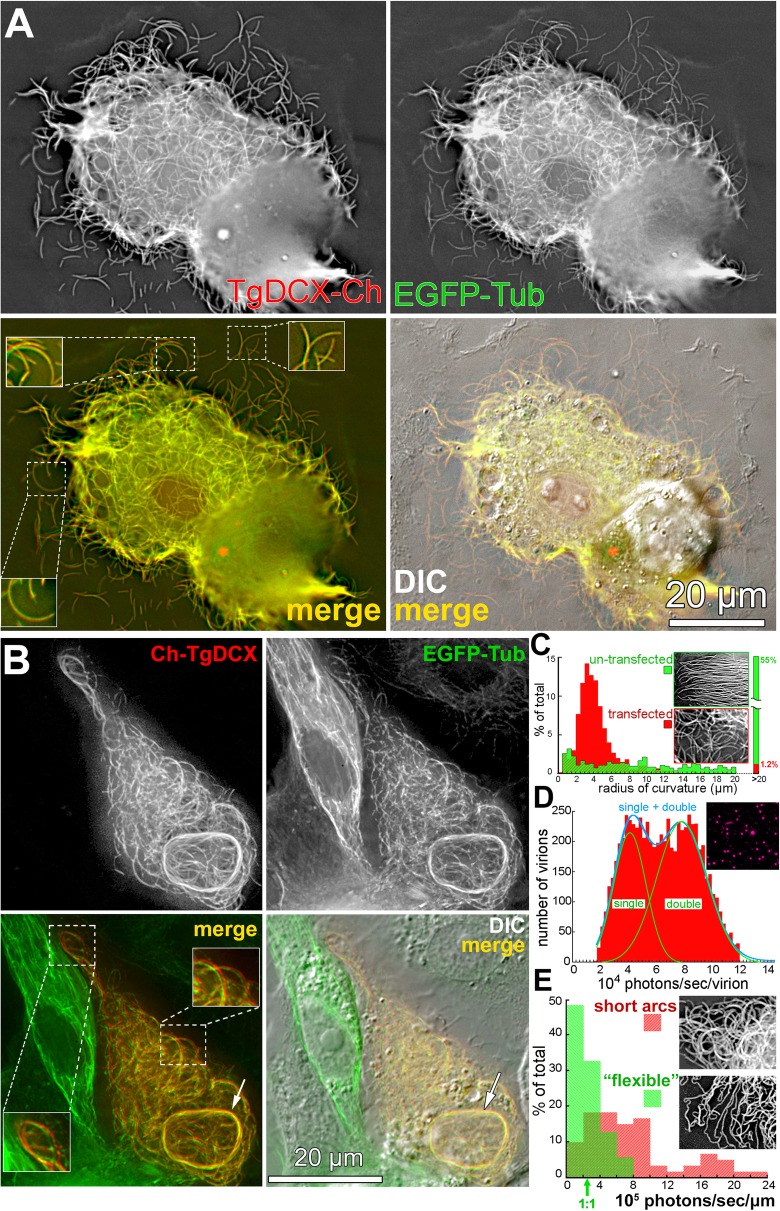 Fig. 3. FP-tagged TgDCX generates curved microtubules in a heterologous system, Xenopus laevis S3 cells. a Deconvolved wide-field images of Xenopus S3 cells expressing EGFP-α-tubulin (green) and TgDCX-mCherryFP (red), showing that TgDCX-mCherryFP is localized to EGFP-α-tubulin containing fibers. TgDCX-mCherryFP expression drives the formation of curved fibers, many of which are short and share similar curvatures (also see Additional file 3: Movie S1). The areas within the dashed outlines are enlarged 1.5x in the small white boxes. b Deconvolved wide-field images of Xenopus S3 cells expressing EGFP-α-tubulin (green) and mCherryFP-TgDCX (red), showing that, similar to TgDCX-mCherryFP, mCherryFP-TgDCX expression drives the formation of curved fibers (also see Additional file 4: Movie S2). Arrows indicate microtubule bundles coated with mCherryFP-TgDCX. Note the fibers containing EGFP-tubulin only in the neighboring untransfected cell, which follow the meandering, gently curved, paths of typical cytoplasmic microtubules. Insets: 1.5x. c Histogram of radii of curvature of microtubules in Xenopus S3 cells, untransfected (green), or transfected with mCherryFP tagged TgDCX (red). Data include 844 microtubule segments (total length 7488âμm) for the untransfected cells and 599 segments (total length 2621âμm) for the transfected cells. All measurable microtubule segments in 8 representative untransfected cells and 7 transfected cells were included in the two histograms. Insets: fluorescent images of subregions of an untransfected (top) and a transfected cell (bottom). d Distribution of photon counts in images of Sindbis virus containing a capsid protein tagged with mCherryFP to be used as the fluorescence calibration standard for molecule counting. Y-axis: number of virions. X-axis: 104 photons/sec/virion. The images commonly include both single virus particles and a variable proportion of unresolved pairs, and occasionally a small number of larger aggregates. The single and double particles can be distinguished as two peaks in the histogram of measured intensities. The smooth blue and green curves overlying the histogram show the least squares fit to a Gaussian distribution with two components. The empirical means (sem) for the two components derived from this fitting are 38,318 (494) and 77,406 (683) photons/sec/virion. Inset: fluorescent image of a field of mCherryFP tagged Sindbis virus particles. e Photon count distribution in images of mCherryFP tagged TgDCX associated with âflexibleâ microtubules (green) or short curved arcs (red). Arrow indicates the expected photon count for FP tagged TgDCX molecules to decorate a single microtubule in a 1:1 TgDCX to tubulin dimer ratio. Y-axis: % of total. X-axis: 105 photons/sec/μm. Insets: fluorescent images containing âflexibleâ microtubules (bottom) or short curved arcs (top) |