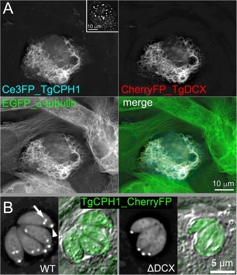 Fig. 5. TgDCX bridges TgCPH1 to tubulin. a Deconvolved wide-field images of Xenopus S3 cells expressing mCerulean3FP-TgCPH1, mCherryFP-TgDCX and EGFP-α-tubulin. Inset: a control Xenopus S3 cell that expresses mCerulean3FP-TgCPH1 but not TgDCX (also see Additional file 2: Figure S1). CPH1 on its own does not bind to microtubules in Xenopus cells, but is recruited to the microtubules by TgDCX. b RHΔku80Δhx (“WT”) and TgDCX knockout (ΔDCX) parasites expressing mCherryFP tagged TgCPH1. CPH1 localizes to daughters (arrows) and adult conoids (arrowheads) regardless of the presence of TgDCX |