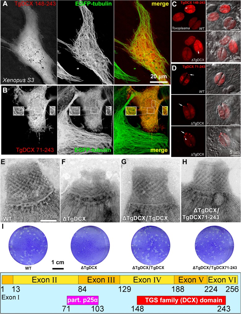 Fig. 6. The DCX domain alone does not support stable microtubule binding in Xenopus cells, or conoid targeting in Toxoplasma. a-b Deconvolved wide-field images of Xenopus S3 cells expressing EGFP-tubulin (green) and either mCherryFP-TgDCX148â243 (a, red) or mCherryFP-TgDCX71â243 (b, red). The boxed insets in b are 1.5x enlarged and contrast-enhanced views of small regions over the nucleus that include the slices from the 3D stacks in which these individual arcs are clearly seen (also see Additional file 5: Movie S3). The DCX domain alone (TgDCX148â243) is not sufficient for microtubule binding, but P25αâ+âDCX domain together (TgDCX71â243) cause binding to microtubules and generation of short arcs. c-d Deconvolved wide-field images of the parental RHÎku80Îhx (âWTâ) and TgDCX knockout (âÎTgDCXâ) parasites expressing either mCherryFP-TgDCX148â243 (c), or mCherryFP-TgDCX71â243 (d), two examples are shown for ÎTgDCX). Arrowheads in c indicate the nucleus. Arrows in d point to the conoid; arrowhead in d points to a daughter conoid. e-h EM images of the conoid region of negatively stained T. gondii. Parental RHÎku80Îhx (e, âWTâ); TgDCX knockout (f, âÎTgDCXâ); knockout parasites transfected with a plasmid expressing either EGFP tagged full-length TgDCX (g, âÎTgDCX/TgDCXâ), or mCherryFP-TgDCX71â243 (h, âÎTgDCX/TgDCX71â243â), both expressed under control of the T. gondii α-tubulin promoter (constitutive, See Fig. 9d). i Plaque assays (see Methods) of the parasite strains used for e-h; the parental T. gondii, TgDCX-knockout parasites, and knockout parasites complemented with full-length TgDCX or the fragment containing only the partial P25α domain and the DCX domain, TgDCX71â243. Annotations are the same as e-h. j Domain structure of TgDCX in which the amino acid boundaries of the partial P25α domain and the DCX domain are numbered |