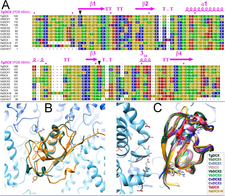 Fig. 7. Sequence and structure conservation among DCX domains of TgDCX orthologues. a Sequences of DCX domains from Toxoplasma gondii, Vitrella brassicaformis, Chromera velia, Trichoplax adhaerens, N- and C-terminal domains of humans doublecortin, and a consensus DCX domain from the NCBI Conserved Domain Database (CD01617), were aligned using the MUSCLE program accessed through JalView (V2.10.5, http://www.jalview.org) with default parameters and displayed colored by polarity. Yellow: non-polar (G, A, V, L, I, F, W, M, P); Green: polar, uncharged (S, T, C, Y, N, Q); Red: polar, acidic (D, E); Blue: polar, basic (K, R, H). Secondary structure elements in TgDCX (beta sheet, âβâ; alpha helix, âαâ; turns, âTâ; and a short stretch of 310 helix), derived from our X-ray crystal structure (PDB 6B4A) of TgDCX148â243, are indicated above the alignment. Black arrowheads indicate residues discussed in the text (TgDCX R152 and HsDCX-NâK53; TgDCX D201). CvDCX1 (EupathDB ID: Cvel_6797), CvDCX2 (EupathDB ID: Cvel_18664), CvDCX3 (EupathDB ID: Cvel_28653), VbDCX1 (EupathDB ID: Vbra_15441), VbDCX2 (EupathDB ID: Vbra_12284), VbDCX3 (EupathDB ID: Vbra21191), PfDCX (EupathDB ID: PF3D7_0517800), TaDCX (Uniprot ID: B3RTF1) and HsDCX (NG_011750). b Superposition of backbone ribbon traces of TgDCX148â243 (dark gray-green; X-ray, 6B4A) on the N-terminal DCX domain of human doublecortin (yellow-orange; solution NMR, 1MJD) docked with the structure of αβ-tubulin (α-tubulin blue, β-tubulin cyan; electron crystallography, 1JFF) onto the cryoEM map of human doublecortin bound to microtubules (4ATU). The DCX domain binds in the groove between protofilaments, making contacts with two αβ-dimers. Side-chains are shown for some of the surface-exposed residues. The view is from the outside of the microtubule, corresponding to Fig. 2c of [9]. The (+)-end of the microtubule is towards the top. c Backbone ribbon threading of apicortin orthologue sequences onto the superimposed experimentally-determined structures of human DCX-N docked on microtubules (4ATU) and TgDCX148â243 (6B4A). The view is from the outside of the microtubule. The structures are rotated 135 degrees clockwise relative to the orientation shown in b. The microtubule (+)-end points toward the bottom right corner of the diagram. Only the portion of one β-tubulin close to the DCX domain is included. Side chains are shown for the electronegative patch on β-tubulin, close to DCX, identified as contact region #3 on β-tubulin by [9]. Side-chains of the residues discussed in the text, K53 on HsDCX-N and R152 on TgDCX are also shown, pointing away from tubulin in these structures |