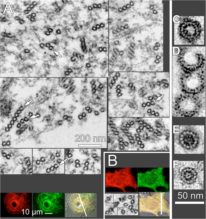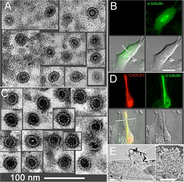 Fig. 11. Correlative light and electron microscopy analysis of microtubules in untransfected CvDCX1-expressing Xenopus cells. a EM images of microtubules in sections of an untransfected Xenopus cell. In all cases where they are countable, 13 protofilaments (pf) are present. No microtubules with other than 13 pf were seen in untransfected cells. b Fluorescence and DIC light microscope images of the cell sectioned in a. The cell is from a line expressing EGFP-α-tubulin. The plane of sectioning in the EM images is shown by the white bar. c EM images of microtubules in sections of a Xenopus cell transfected with mCherryFP-CvDCX1. All microtubules have 13 pf. The tannic-acid-enhancement of microtubule staining (see Methods) is more effective when the microtubules are heavily decorated, which makes the protofilaments more obvious and more easily countable, but the diameter of the microtubules is approximately the same as in untransfected cells. d Fluorescence and DIC light microscopy images of the cell sectioned in c. mCherryFP-CvDCX1 is shown in red, EGFP-α-tubulin in green. The plane of section is shown by the white bar. The magnification is the same as for b. Note that the elongated narrow extension of the transfected cell lies on top of another untransfected cell, running over the edge of the latterâs nucleus. e Low magnification EM images of a cross-section of the cell shown in d. The thin extension of the transfected cell is seen crossing over the underlying untransfected cell. The region within the white box, shown enlarged on the right, contains >â100 parallel microtubules viewed in cross-section, appearing as tiny black doughnuts at this magnification |