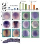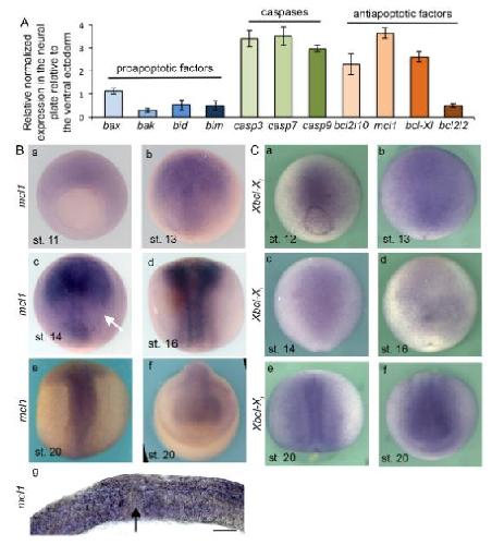 Figure 2: mcl1 expression pattern suggests a role for this protein in axial organizer development. (A) RT-qPCR analysis of apoptotic cascade mRNA in Xenopus early neurula. Analysis performed on RNA extracted from dissected neural plates, and ventral ectoderms (N=15) of X. laevis embryos at stage (st.) 14 for pro-apoptotic factors â bak, bad, bid, bim, including caspases (casp) - casp3, casp7, and casp9 and anti-apoptotic factors â bcl2l10, mcl1, bcl-xl, and bcl2l2. Expression is normalized relative to ef1α. Relative normalized expression is indicated as means ± s.e. (B) mcl1 expression pattern. ISH using a probe for mcl1 from stage 11 to stage 20 embryos; (a) ventral view, dorsal up, (b-e) dorsal view anterior up, (f) anterior view dorsal up. (g) Transverse section of (c) in the posterior part of the embryo. The scale bar stands for 200μm. The white arrow indicates the border between the ectoderm and the neuroectoderm. The black arrow indicates the notochord. (C) bcl-xl expression pattern in X. laevis gastrula and neurula. ISH using a probe for the anti-apoptotic gene bcl-xl from stage 12 to stage 20. Embryos are shown dorsal side up.