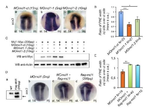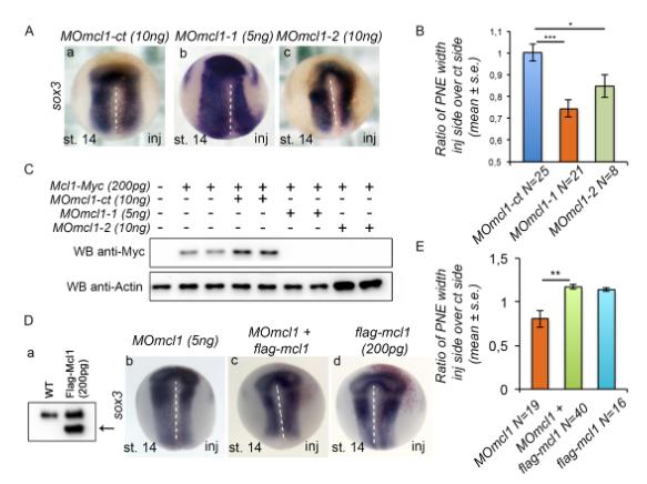 Figure 3: Mcl1 depletion decreases the neuroepithelium size. (A) Mcl1 MOs decrease the posterior neural plate width. ISH for sox3. Representative stage (st.) 14 embryos injected (inj) with (a) MOmcl1-ct (N=25); (b) MOmcl1-1 (N=21); or (c) MOmcl1-2 (N=8). (B) Quantification of A. (C) MOmcl1 blocks mcl1 translation. Western Blot on st.13 Xenopus extracts using antibody against Myc-tag. Actin is used as a loading control. (D) Flag-Mcl1 rescues the MO-mediated depletion of Mcl1. RNA encoding flag-Mcl1 or MOmcl1-1 were injected in embryos either alone or together with a tracer (red) as indicated. (a) Western Blot using anti-Flag antibody on st.13 Xenopus protein extracts injected with RNA encoding flag-mcl1 (200pg). The black arrow indicates the band corresponding to the flag epitope of 33Kd. (b-d) ISH for sox3. Representative st.14 embryos are shown injected with (b) MOmcl1-1 (N=10), (c) MOmcl1-1 and flag-mcl1 (N= 40) or (d) flag-mcl1 alone (N=16) at the indicated doses. (E) Quantification of D. PNE: posterior neuroepithelium. White dashed line indicates the midline. Relative normalized expression is indicated as means ± s.e. * p<0.05, ** p<0.01 , *** p<0.001.