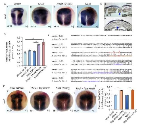Figure 6: A form of Mcl1 that cannot be phosphorylated by Gsk3β increases the neural plate size with a higher efficiency and compensates the overexpression of the pro-apoptotic proteins XBax and hBak. (A) ISH on stage (st.) 14 embryos using probes against sox3 on embryos injected with (a) Xenopus mcl1-myc (xmcl1), (b) human mcl1 (hmcl1), (c) hmcl1S159A or (d) Xenopus bcl-xl (bcl-xl). (B) Histological sections of MOmcl1- (a) and hmcl1S159A- (b) injected embryos at stage 14 following ISH using sox3 probe and LacZ as a tracer. Blue arrow indicates the notochord. Scale bar stands for 200μm. (C) Quantification of A with addition of mouse mcl1 (mmcl1) mRNA injected embryos. (D) Alignment of human Mcl1 (isoform 1) and X. laevis Mcl1 sequences. In Mcl1 sequence the enriched region in proline (P), glutamic acid (E), serine (S) and threonine (T) residues, referred to as the âproline/glutamic acid/serine/threonine (PEST) region is shown in brown. S155, S159 and T163 shown in red are Gsk3β phosphorylation sites either confirmed in human, or putative in X. laevis. The X. laevis Bcl-2 Homology (BH) domains are shown in blue. In human Mcl1 sequence the black star indicates human S159 and the red star indicates T163. (E) Overexpression of flag-mcl1 compensates for Xbax and hbak overexpression. ISH using sox3 probe was performed at stage 14 Xenopus embryos. Four-cell stage embryos were injected in one dorsal blastomere, either with (a) Xenopus bax (Xbax), (b) Xbax and flag-mcl1, (c) human bak (hBak), and (d) hbak and flag-mcl1 (N= ) mRNAs. LacZ mRNA was used as a tracer of the injected side. Embryos are shown dorsal view anterior up. (F) Quantification of E. PNE stands for posterior neuroepithelium. White dashed lines indicate the midline. N represents the number of embryos. Relative normalized expression is indicated as means ± s.e. ** p<0.01 , *** p<0.001.
