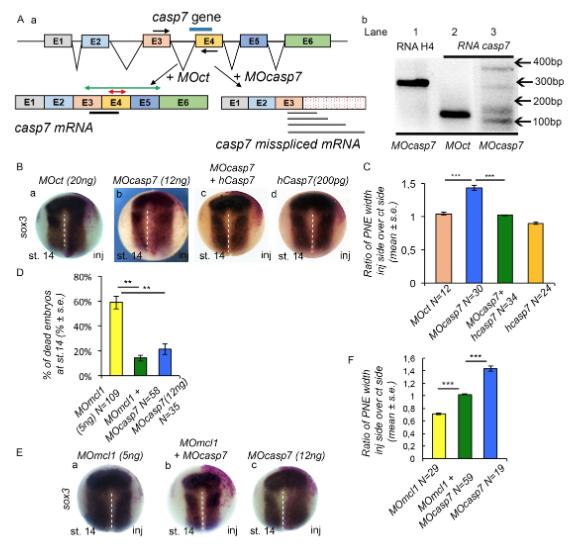 Figure 5: Depletion of caspase-7 compensates for Mcl1 depletion. (A) (a) Schematic representation showing the genomic organization of the caspase-7 gene (casp7) in X. laevis. The region targeted by the splice-blocking MO casp7 (MOcasp7) is shown (blue line). The two black arrows indicate the location of the two primers used to amplify exon3 (E3) and exon4 (E4) sequences in the RT-PCR analysis (b). The substrate pocket (green double end arrow) and the active site (red double end arrow) are shown. (b) MOcasp7 efficacy was validated by RT-PCR using primers as indicated in (a). Total RNA was isolated from stage (st.) 14 MOcasp7 or control MO (MOct)- injected embryos and analyzed using E3-E4 casp7 primers (a). Misspliced casp7 mRNA forms are observed in MOcasp7 injected embryos compared to the normally spliced casp7 mRNA detected in the MOct- injected embryos (Lanes 2 and 3). Histone H4 is used as an internal control and normally spliced in MOcasp7 injected embryos (Lane 1). (B) Depletion of Casp7 increases neuroepithelium width. ISH of st. 14 embryos using probes against sox3 (a-d). Embryos injected with (a) MOct (N=12); (b) MOcasp7 (N=30); (c) MOcasp7 together with human casp7 (hcasp7) (N=34) and (d) hcasp7 (N=24) at the indicated doses are shown dorsal view anterior up. (C) Quantification of B. (D-F) Casp7 depletion rescues Mcl1 depletion apoptotic phenotypes. (D) Percentage of dead embryos at st. 14 was calculated on MOmcl1 (N=109), MOmcl1 together with MOcasp7 (N=58), and MOcasp7 (N=35) injected embryos. (E) ISH using probes against sox3 on embryos injected with (a) MOmcl1 (N=29); (b) MOcasp7 and MOmcl1 (N=59), or (c) MOcasp7 (N=19). Representative embryos at st. 14 are shown dorsal view anterior up. (F) Quantification of E. PNE stands for posterior neuroepithelium. The dashed white line indicates the midline. N represents the number of embryos. Relative normalized expression is indicated as means ± s.e. ** p<0.01 , *** p<0.001.