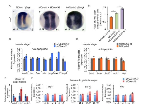 Figure 7: Whereas depletion of the pro-apoptotic transcription factor Barhl2 compensates for Mcl1 depletion, Barhl2 does not regulate mcl1 transcription (A) Barhl2 depletion rescues Mcl1 depletion. ISH using probes against sox3 on embryos injected with (a) MOmcl1 (N=10); (b) MOmcl1 and MObarhl2 (N=10); (c) MObarhl2 (N=10). Representative embryos at stage (st.) 14 are shown dorsal view anterior up. The dashed white line indicates the midline. (B) Quantification of A. Relative normalized expression is indicated as means ± s.e. PNE stands for posterior neuroepithelium. (C-F) Analysis of apoptotic genes transcriptional regulation by Barhl2. RT-qPCR analysis on RNA extracted from X. laevis individual embryos injected into two dorsal blastomeres at the 2-cell stage either with MObarhl2-ct or MObarhl2. (C,D) st. 13 embryos (N=10); (E) dissected st. 13 axial organizer (N=10); (F) st. 8, 9 and 10 embryos (N=10). For (C, D, E) expression is normalized relative to actin and ef1α. In (F) the expression of mcl1, bcl-xl and xiap is normalized to st. 8. N represents the number of embryos. Relative normalized expression is indicated as means ± s.e.m. chd stands for chordin. ** p<0.01 , *** p<0.001.