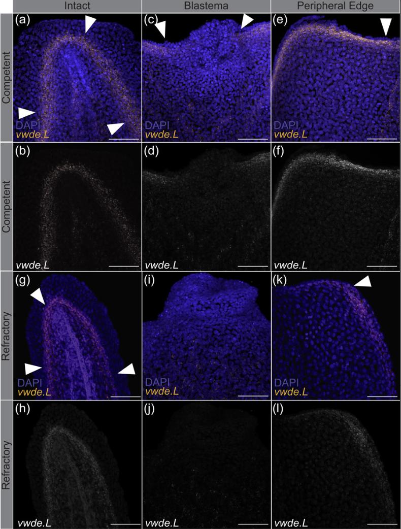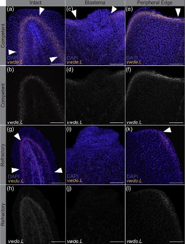 Figure 3. vwde expression is tightly linked with the regenerationâcompetent environment. In situ hybridization chain reaction probing for vwde in (aâf) regenerationâcompetent Xenopus laevis tails (a,b) before amputation, (c,d) blastema 24âhr postamputation, and (e,f) the peripheral edge of the amputation plane 24âhr postamputation. (gâl) Regenerationârefractory tails (g,h) before amputation, (i,j) blastema 24âhr postamputation, and (k,l) the peripheral edge of the amputation plane 24âhr postamputation. White arrows indicate the location of vwde expression. Scale barsâ=â100âµm. DAPI, 4â²,6âdiamidinoâ2âphenylindole [Color figure can be viewed at wileyonlinelibrary.com]