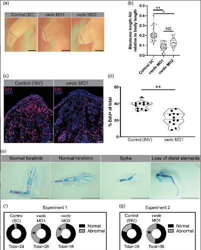 Figure 4. Vwde is essential for limb regeneration. (a) Representative images of blastemas 16 days postamputation (9 days postmorpholino administration) from standard control morpholino (âControl (SC)â), vwdeâtargeting morpholino 1 (vwde MO1), and vwdeâtargeting morpholino 2 (vwde MO2). Dotted line indicates amputation plane, blastemas are all tissuedistal to amputation plane. Scale barsâ=â1âmm. (b) Quantification of blastema length 16 days postamputation. Median and quartiles noted with dotted lines, **pâ<â.01, *pâ<â.05 by nested T test. (c) Representative EdU stained sections of blastemas 10âdpa (3 days postelectroporation) of vwde morpholino 1 inverted (âControl (INV)â) and vwdeâtargeting morpholino 1. Scale barsâ=â100âµm. (d) Quantification of percent of blastema cells positive for EdU in control (INV) and knockdown (vwde MO1). Each dot represents a limb, 4â5 animals per group. Median and quartiles noted with dotted lines, **pâ<â.01 by nested T test. (e) Representative skeletal preparations of limbs after full regeneration after knockdown of Vwde at 7âdpa. From left to right, normal forelimb, normal hindlimb, spike, and loss of distal elements. Scale barsâ=â5âmm. (f) Donut plots of regenerative outcomes, pooled as abnormal versus normal from experiment with Control (SC), vwde MO1, and vwde MO2. *Pâ<â.05 by Fisher's exact test comparing Control (SC) versus vwde MO1 and Control (SC) versus vwde MO2. (g) Donut plots of regenerative outcomes, pooled as abnormal versus normal from experiment with Control (INV) and vwde MO1. *pâ<â.05 by Fisher's exact test comparing outcomes from Control (INV) compared to vwde MO1. Edu, 5âethynylâ2â²âdeoxyuridine [Color figure can be viewed at wileyonlinelibrary.com]