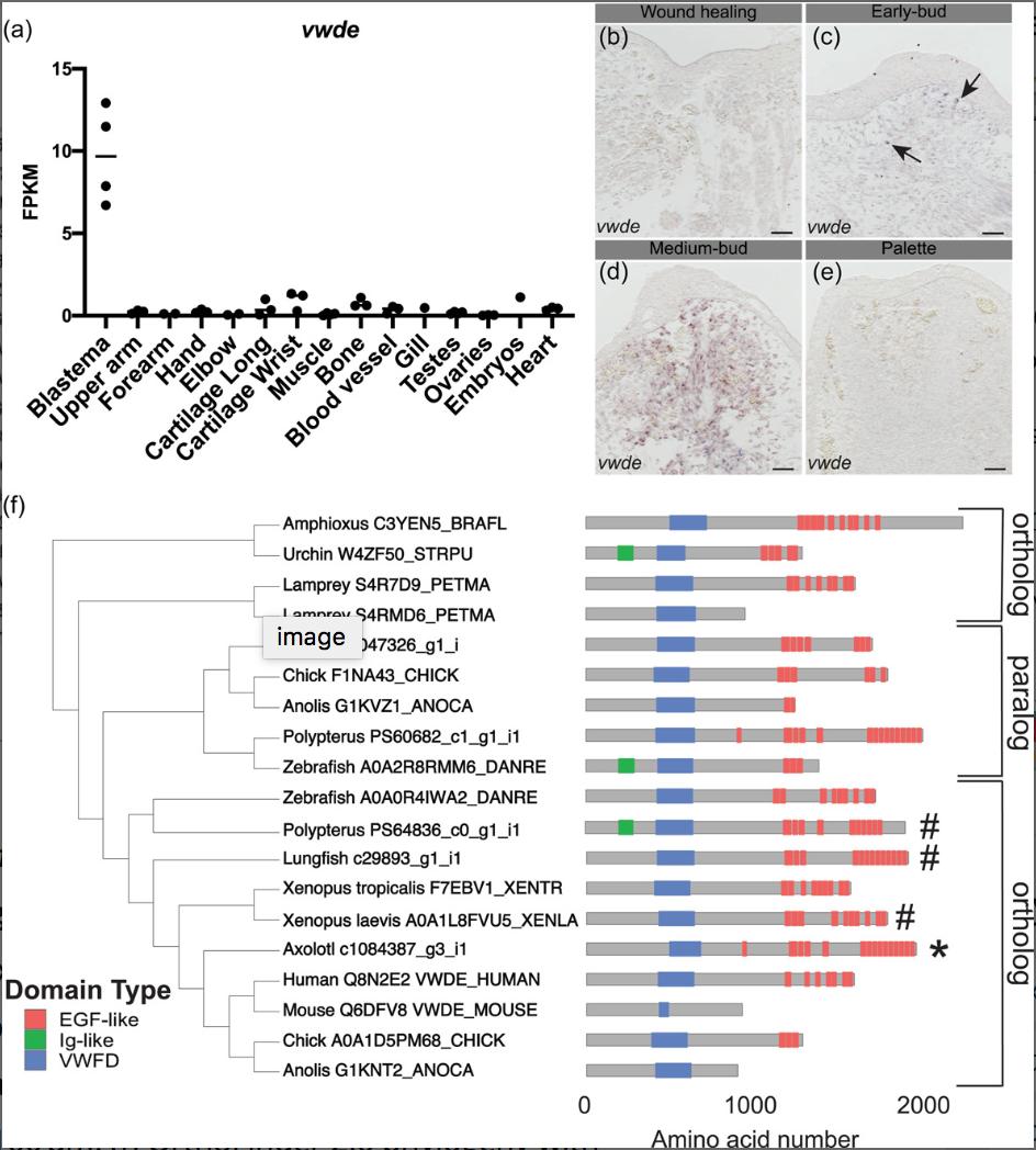 Figure 1. von willebrand factor D and EGFâlike domains (vwde) is a blastemaâenriched gene that is found across deuterostomes. (a) vwde (contig c1084387_g3_i1) expression in FPKM across tissues sampled from Bryant et al. (2017). Proximal and distalblastema samples are combined. (bâe) RNA in situ hybridization for vwde at (b) wound healing (3 days postamputation), (c) earlyâbud blastema, (d) mediumâbud blastema, and (e) palette stage regenerating limbs. Black arrows indicate vwde expression, scale bar is 100âµm. (f) OrthoFinder 2.0 phylogeny with corresponding protein domain structure for putative Vwde orthologs. Protein domain pictures were generated with drawProteins (Brennan, 2018). Species and Uniprot ID or transcriptome contig number are included. Polypterus vwde contained multiple splice isoforms and the closest match to axolotl Vwde is shown here. Axolotl Vwde is denoted with â*â and other species Vwde that are described in this manuscript are marked with â#.â Orthologs to the Vwde studied in this study are indicated with brackets, paralog is also denoted with brackets. FPKM, fragments per kilobase of exon mapped [Color figure can be viewed at wileyonlinelibrary.com]