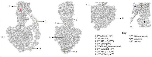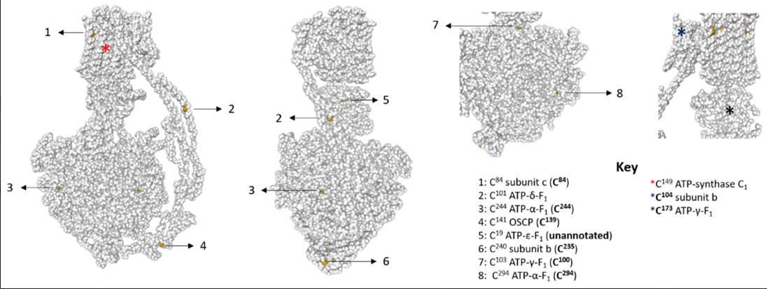 Figure 2. Cysteine residues in bovine Fo-F1 ATP synthase in catalytic state 3A. Numbered cysteine residues are highlighted in yellow. The key lists the cysteine residue by amino acid number for the bovine enzyme with the equivalent X. laevis residue in brackets in bold. A coloured asterix denotes the predicted position of additional cysteine residues in X. laevis. Additional cysteine residues are highlighted in bold in the key if they are likely to be solvent exposed. No structural data is available for subunit g and C3.