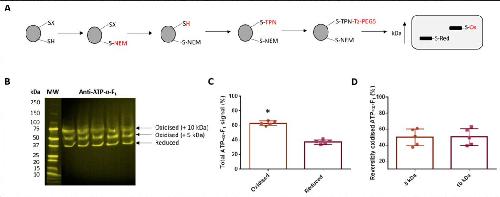 Figure 4. Reversible ATP-α-F1 oxidation is significant in oocytes. (A). Catalyst-free trans-cyclooctene-6methyltetrazine (TCO-Tz) Click PEGylation scheme for reversibly oxidised thiols. Left to right: Reduced thiols are alkylated with NEM. Reversibly oxidised thiols are reduced with TCEP before being alkylated with TCO-PEG3-NEM (TPN). TPN labelled thiols are incubated with Tz-PEG5 to initiate the catalyst-free IEDDA Click reaction. Reversibly oxidised thiols are then mass shifted when assessed by Western Blot owing to a PEG induced electrophoretic mobility shift. (B). Western blot image showing reversibly oxidised (i.e., mass shifted 5 and 10 kDa bands) relative to reduced ATP-α-F1 (i.e., lower band) in X. laevis oocytes (n = 5). MW = molecular weight. (C). Percent reversibly oxidised (i.e., mass shifted) compared to reduced (unshifted) ATP-α-F1 quantified. Percent reversibly oxidised ATP-α-F1 is significantly (p = 0.0007) greater than the amount of reduced ATP-α-F1. An asterix denotes statistical significance as assessed by a paired Studentâs t-test. (D). Quantified percentage contribution of the 5 and 10 kDa bands to the total mass shifted (i.e., reversibly oxidised) signal. No significant difference (p = 0.09611) in the contribution of the 5 and 10 kDa band signal was observed as assessed by a paired Studentâs t-test. Each n is the weighted mean of 10 oocytes.