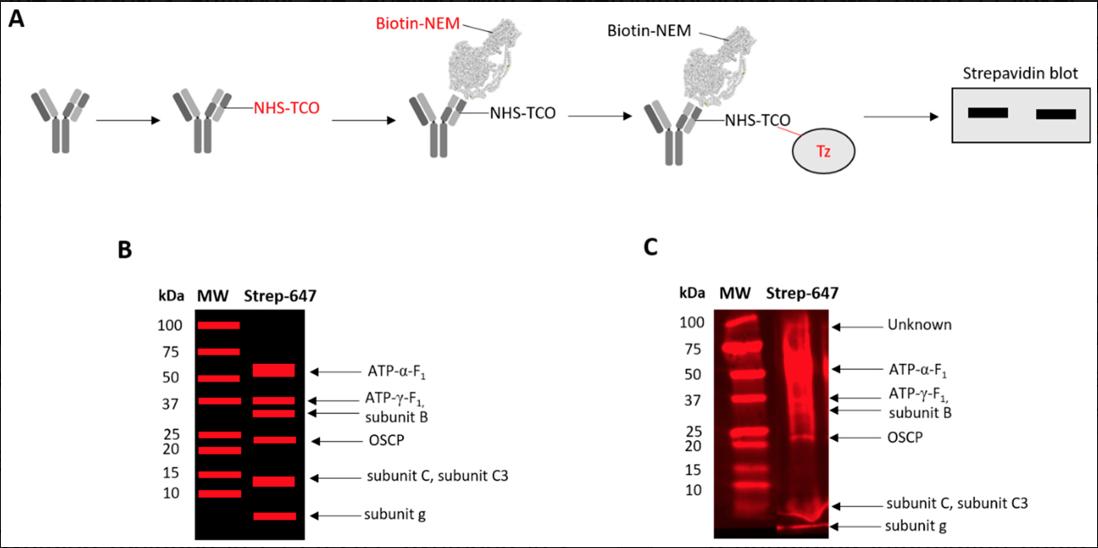 Figure 3. Several F1-Fo ATP synthase subunits are reversibly oxidised. (A). Catalyst-free trans-cyclooctene-6methyltetrazine (TCO-Tz) immunocapture coupled to redox affinity blotting workflow. From left to right: Primary amines in the ATP-α-F1 antibody are labelled with a heterobifunctional NHS-PEG4-TCO linker. After excess NHS is quenched with Tris (not shown), the labelled antibody is incubated with Biotin functionalised maleimide labelled reversibly oxidised thiols in mitochondrial membranes to capture the F1-Fo ATP synthase. Agarose beads substituted with 6-methyltetrazine are then used to selectively capture the antibody-synthase complex. After washing away contaminants with a spin cup, samples are boiled, denatured, and reduced to elute subunits for streptavidin blotting. Streptavidin, conjugated Alexa Fluor⢠647 positive bands denote reversibly oxidised subunits. (B). A predicted reversibly oxidised subunit profile based on Table 1. (C). Representative image of an experimentally observed reversibly oxidised subunit profile alongside a molecular weight (MW) ladder. Arrows indicate the predicted identity of the observed bands. The image shows several F1-Fo ATP synthase subunits are reversibly oxidised. An unpredicted band at 100 kDa was observed (see main text). Clickable TCO-Tz immunocapture coupled to redox affinity blotting was performed on five pools of 10 X. laevis oocytes. Each lane represents the weighted mean of 10 oocytes.
