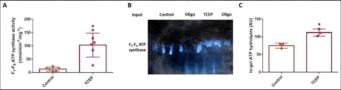 Figure 5. Reversible thiol oxidation inhibits the F1-Fo ATP synthase. (A). Chemically reversing thiol oxidation using TCEP substantially increases F1-Fo ATP synthase activity. Specifically, oligomycin sensitive F1-Fo ATP synthase activity is significantly greater (p = 0.0007) in TCEP (n = 6) compared to control oocytes (n = 6) in X. laevis. (B). Inverted Hr-CNPAGE image of F1-Fo ATP synthase mediated in-gel ATP hydrolysis. No signal is observed in oligomycin treated controls and a decreased signal in the TCEP condition. (C). Densitometry based quantification reveals a significant (p = 0.0067) increased F1-Fo ATP synthase mediated ATP hydrolysis in TCEP (n = 3) compared to control oocytes (n = 3) in X. laevis. Statistical significance is indicated by an asterix as assed by an independent Student’s t-test. Each n is the weighted mean of 10 oocytes.