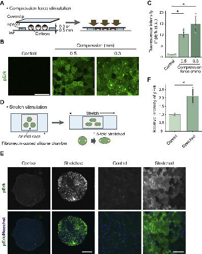 (D) Schematic diagram of the force applied to embryos by stretching. The stretched chamber was kept for 5 min, and then the animal caps were fixed for immunofluorescence.