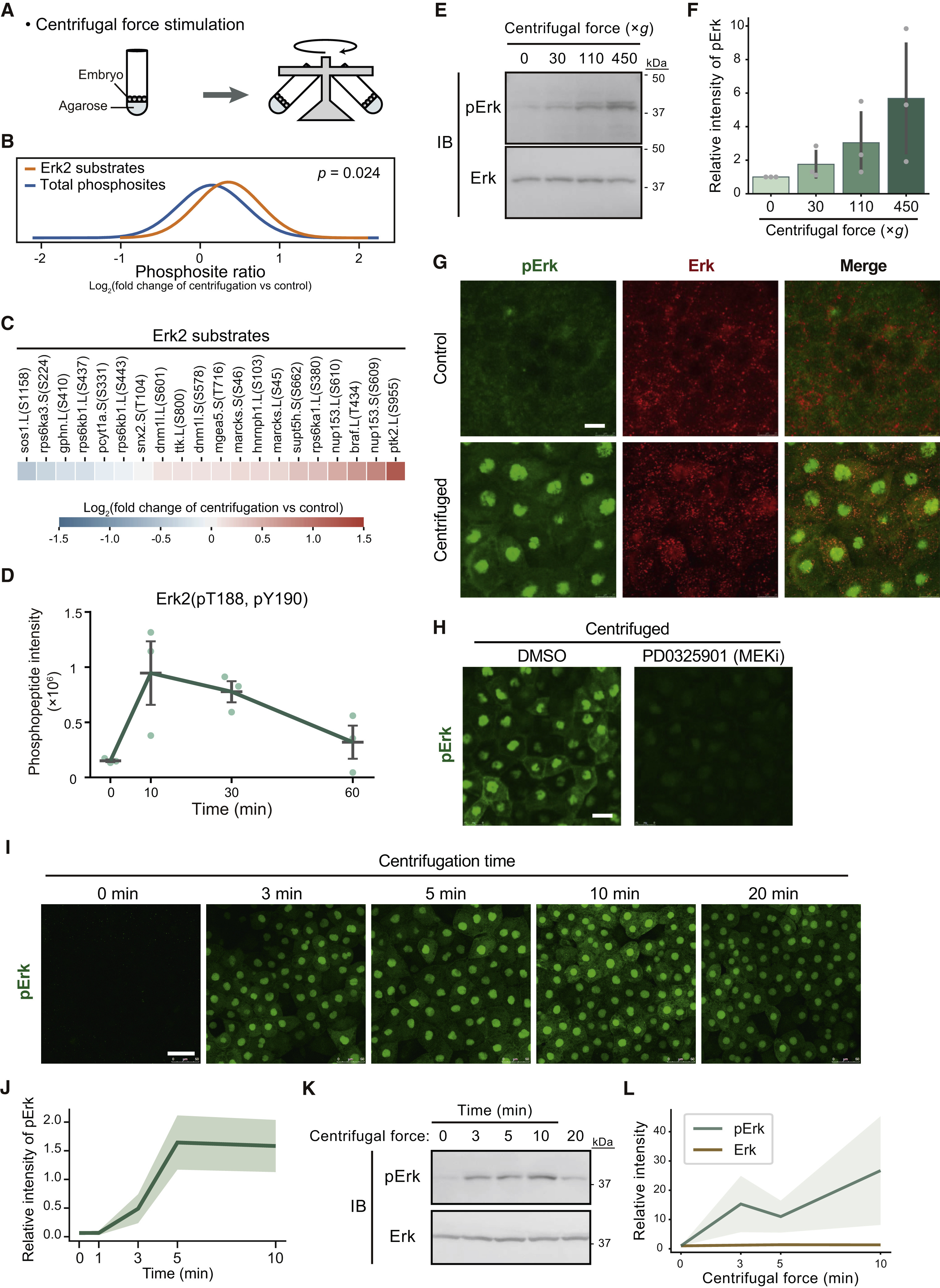 (B) Normal density curves of the ratio of phosphosites between centrifuged and control conditions from phosphoproteomic data. Blue and orange lines represent the density curve in the total phosphosites and that in Erk2 substrates, respectively. The p value represents statistical significance evaluated by the Mann-Whitney U test.