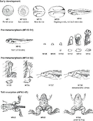 The key life stages of Xenopus. Stages of Xenopus development as illustrated by Nieuwkoop and Faber (1994). Eggs are fertilised externally and embryos begin to develop, undergoing gastrulation, neurulation, organogenesis and tailbud extension. They then hatch as larvae within 3-4â