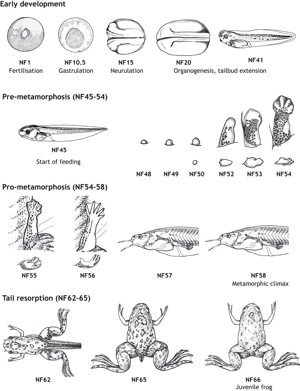 days of development, the larvae/tadpoles begin feeding (from NF45 onwards). From NF48 onwards, during a âpre-metamorphicâ phase, animals develop limb buds, starting with the hindlimbs, which form joints and digits during metamorphosis. Metamorphosis ends with resorption of the tail at NF62-66. Following tail resorption, froglets become juveniles in around 4-6â