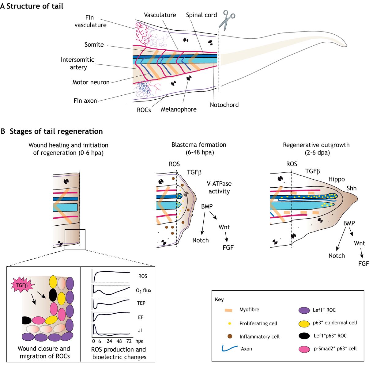 h post-amputation, hpa), which requires bioelectric changes and the upregulation of signalling molecules (shown in inset), including reactive oxygen species (ROS) and transforming growth factor β (TGFβ). TGFβ signalling is required for wound healing by p63+ epidermal cells. Lef1+ ROCs, which can also express p63, contribute to the wound epithelium and to the initiation of regeneration. From 6-48â
