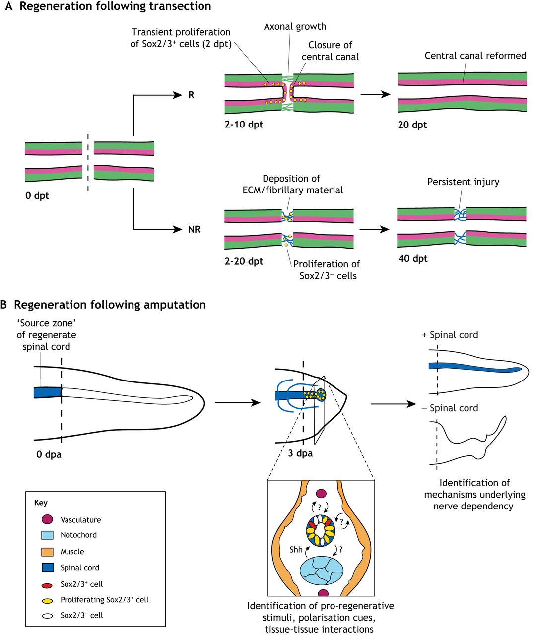 dpt. (B) Spinal cord regeneration following tail amputation. The regenerate spinal cord originates from cells rostral to the amputation site (blue). The injured spinal cord first forms a bulbous neural ampulla. This structure (shown in inset) contains Sox2/3+ cells (red) that begin to proliferate (yellow) at 2-3â