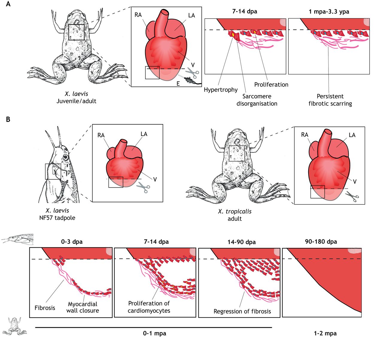 years post-amputation (ypa). (B) By contrast, heart regeneration is successful in X. laevis tadpoles (NF57) and X. tropicalis adults (1 year old) following apical resection using surgical scissors. Amputation of the ventricular apex (dashed line) leads to wound healing, cardiomyocyte proliferation (yellow nuclei) and deposition of connective tissue (fibrosis, pink), which gradually reduces as regeneration continues until little to no scar is present. The time required for heart regeneration in the X. laevis tadpole (top time line; dpa, days post-amputation) is longer than that required in the X. tropicalis adult (bottom timeline; mpa, months post-amputation).