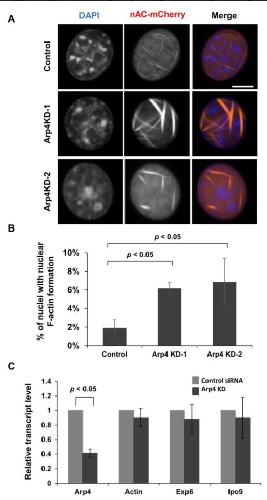 Figure 1. Knockdown of Arp4 increased nuclear F-actin. (A) Confocal microscopy images of NIH3T3 cells transfected with control siRNA (control), Arp4-1 siRNA (Arp4 KD-1), or Arp4-2 siRNA (Arp4 KD-2). Nuclear F-actin formation was detected by expressing the nuclear actin probe nAC-mCherry. Nuclei were labeled using DAPI (blue). Bar = 10 μm; (B) Quantifications of nuclear F-actin formation in control cells (control+nAC-mCherry) and Arp4 KD cells (Arp4 KD-1 or Arp4 KD-2+nAC-mCherry) cells. For the quantification, 309 control cells, 308 Arp4 KD-1 cells, and 306 Arp4 KD-2 cells were analyzed. Data shown are mean ± S.D. (n ⥠3); (C) Quantitative RT-PCR analysis of Arp4, actin, exportin 6 (Exp6), and importin 9 (Ipo9) mRNAs in control and Arp4 KD-1 cells. Results shown are values relative to those in the control cells.