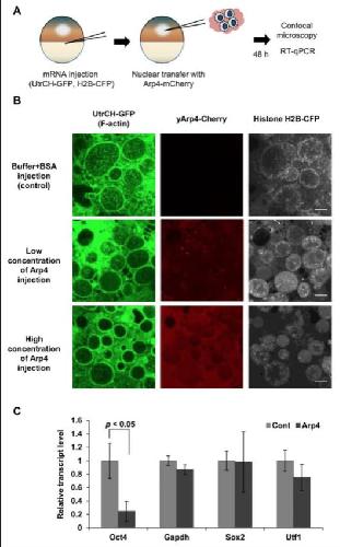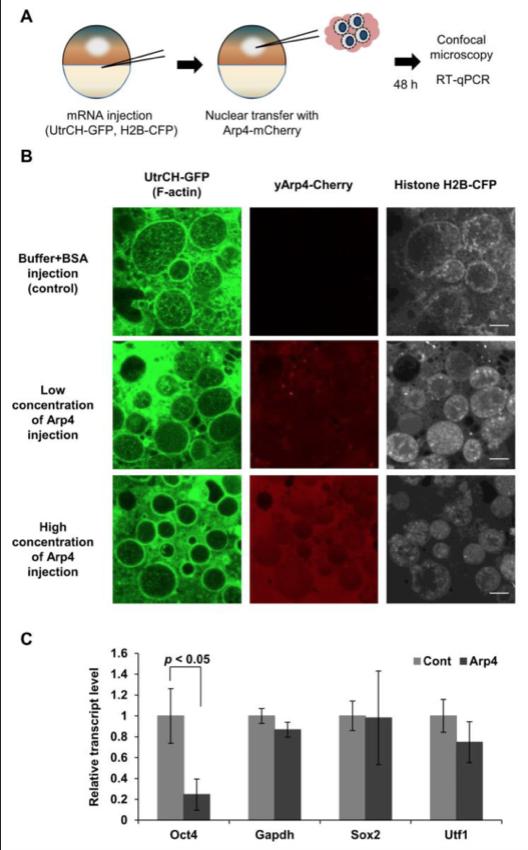 Figure 2. Injection of purified Arp4 suppresses F-actin formation and Oct4 expression in mouse nuclei transplanted into Xenopus oocytes. (A) A schematic diagram of the experimental strategy used to visualize the nuclear F-actin formed in the transplanted nuclei. Dissected GVs were alive in mineral oil and were sufficiently transparent to permit observation of interior structures by confocal microscopy; (B) The polymerization of actin in the transplanted nuclei was suppressed by injected Arp4-mCherry in a concentration-dependent manner; (C) Levels of mouse Oct4, Gapdh, Sox2, and Utf1 mRNAs were quantified in the transplanted nuclei after injecting Arp4-mCherry into oocytes. The mRNA levels (mean ± SEM, n = 3) shown are relative to those in the control nuclei.