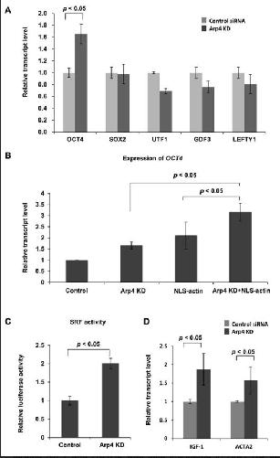 Figure 3. Effects of Arp4 KD on gene expression. (A) Expression levels of OCT4, SOX2, UTF1, GDF3, and LEFTY1 mRNAs in Arp4 KD cells (Arp4-1 siRNA) were quantified and are shown relative to their respective levels in the control cells expressing control siRNA; (B) The expression level of OCT4 in control non-treated NIH3T3 cells, Arp4 KD cells, cells ectopically expressing NLS-actin (NLS-actin), and Arp4 KD cells ectopically expressing NLS-actin (Arp4 KD+NLS-actin). Values shown are relative to their respective levels in control cells; (C) The SRF-RE reporter plasmid was introduced into NIH3T3 cells expressing control-siRNA (control) or Arp4-1 siRNAs (Arp4 KD), and SRF responsive luciferase activity in each sample was measured as described in the Materials and Methods section. The plot shows activity relative to that in the control cells, the value for which was assigned as 1.0; (D) Quantitative RT-PCR analysis of mRNAs of SRF-targeting genes IGF-1 and ACTA2 in control and Arp4 KD cells. The expression level of each gene was normalized with respect to that of the GAPDH gene. Data shown are mean ± S.D. (n ⥠3).