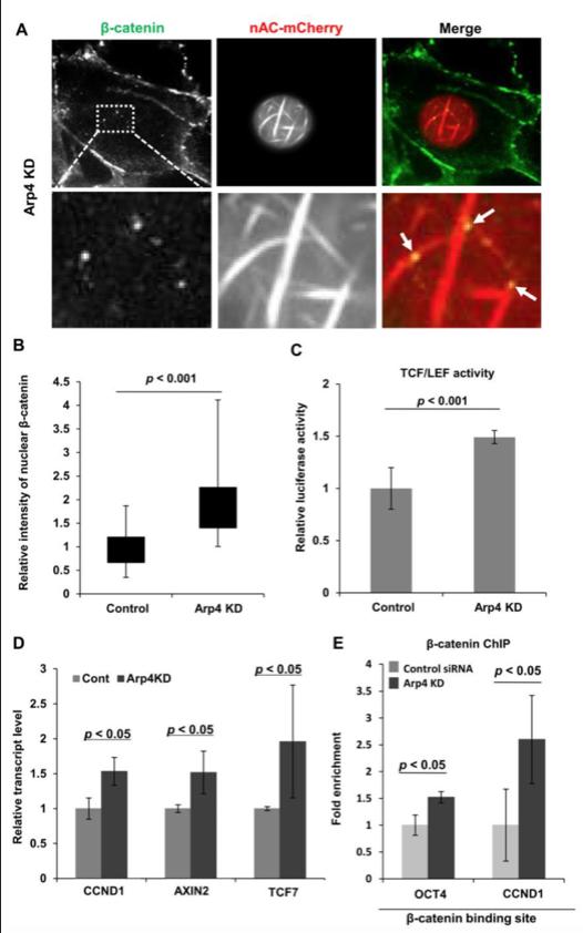 Figure 4. Arp4 is involved in β-catenin-dependent gene expression through suppressing nuclear F-actin formation. (A) NIH3T3 cells expressing siArp4-1 (Arp4 KD) and nAC-mCherry were immunostained with a specific β-catenin antibody. The arrows show colocalization of nuclear F-actin and β-catenin. Bar = 5 μm; (B) Signal intensities of β-catenin in the nucleus and cytoplasm were measured in control or Arp4 KD cells, and the relative amount of nuclear β-catenin was shown. Box plot, the amount of β-catenin in the nucleus relative to that in the cytoplasm and n = 52; (C) A TCF/LEF reporter plasmid construct was introduced into the control or Arp4 KD cells, and TCF/LEF responsive luciferase activity was measured in each sample. Luciferase activity shown is relative to that in the control cells; (D) Quantitative RT-PCR analysis of mRNAs of TCF/LEF targeting genes, CCND1, AXIN2, and TCF7. The expression level of each gene in control siRNA and Arp4 KD cells was normalized with respect to that of the GAPDH gene; (E) The binding of endogenous β-catenin to its targeting sites in OCT4 and CCND1 genes was analyzed by quantitative ChIP assay, using an antibody specific for β-catenin. The values shown are relative to those in control cells. Data shown are mean ± SD (n ⥠3).