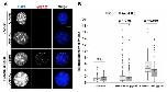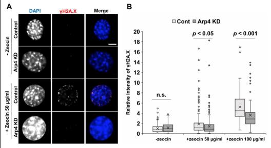 Figure 5. The effect of Arp4-KD in DNA double-strand break repair. Control siRNA (control or cont) or siArp4-1 (Arp4 KD) was introduced into NIH3T3 cells, and cells were incubated for 24 h. The cells were, then, treated with zeocin (50 or 100 µg/mL) for 1 h and subjected to γH2A.X staining a specific antibody and DAPI staining. The cells were observed under a fluorescent microscope (A), and the relative fluorescence intensity of γH2A.X to that of DAPI was determined using Fiji image analysis software (B). Box plot, the signal intensity of γH2A.X relative to that of DAPI and n > 88.