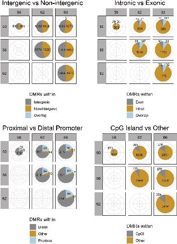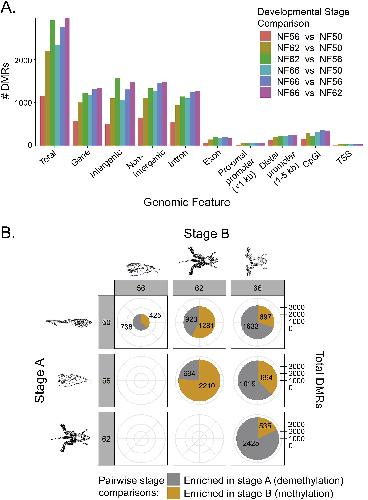 Supplemental Fig. 9. Distribution of differentially methylated regions (DMRs) among specific genomic features at four stages of metamorphosis. Shown are the number and relative proportion of intergenic vs intragenic, exonic vs intronic, promoter vs non-promoter, and CpG island vs non-CpG island DMRs for each pairwise stage comparison. For all pie charts, the area of the pie chart reflects the total number of DMRs identified. The numbers of DMRs within each category is also indicated. Differentially methylated regions were selected if ≥ 50% of the DMR was within the genomic feature. For the intergenic vs. intragenic and the exonic vs. intronic comparisons, rounding led to some DMRs not being counted, and these are labelled as “Other”. We did not see any differences in the relative distribution of DMRs among different genomic features during metamorphosis. |