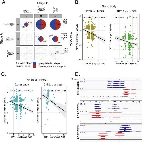Fig. 3. Gene expression changes in X. tropicalis tadpole brain during metamorphosis analyzed by RNA-seq and their relationship to changes in DNA methylation analyzed by MethylCap-seq. We conducted RNA-seq on total RNA isolated from X. tropicalis tadpole brain (preoptic area/thalamus/hypothalamus) at four stages of metamorphosis (n â= â3 per stage). We used DESeq software to identify genes whose mRNA levels changed during metamorphosis (differentially expressed genes - DEGs). A. Shown are pie charts with pairwise comparisons among the four stages of metamorphosis of DEGs. The numbers in the red areas of the pie charts represent genes upregulated in Stage B, while the numbers in the blue areas of the pie charts represent genes downregulated in Stage B. Gene regulations changes increased as metamorphosis proceeded, with roughly half the genes upregulated and half downregulated. B. Correlation between overlapping DMRs and DEGs by direction and magnitude of change within gene bodies comparing pre-metamorphosis (NF 50) with metamorphic climax (NF 62) and pre-metamorphosis and the completion of metamorphosis (NF 66). Shown are scatter plots, Pearson correlation coefficients, and p-values for each comparison, with DEG fold-change on the y-axis and differentially methylated region (DMR) height on the x-axis (Log2A/B, where A is NF 62 or 66 and B is NF 50). The values were plotted and a regression line was fit (black line). A 95% Confidence Interval (light-gray region) is also shown around the regression line. There were no statistically significant correlations for these comparisons in the region 5 âkb upstream of the transcription start site (TSS; data not shown). C. Correlation between overlapping DMRs and DEGs by direction and magnitude of change within gene bodies and at 5 âkb upstream of TSSs comparing pro-metamorphosis (NF 56) with metamorphic climax (NF 62). D. Three examples of a negative correlation between DNA methylation and gene transcription in tadpole brain during metamorphosis (top and middle panels: DNA demethylation; bottom panel: DNA methylation). Shown are screenshots of MethylCap-seq (blue) and RNA-seq (red) reads at discrete genomic regions at four stages of metamorphosis. Reads were mapped to the reference genome using the UCSD Genome Browser. NF stage â Nieuwkoop-Faber developmental stage. Numbers in brackets represent the peak height range. Gene IDs and symbols: (top) XLOC_002166; unknown, (middle) XLOC_030199.1; avpr1a, (bottom) new_exon_scaffold_851_1255.1; unknown. |