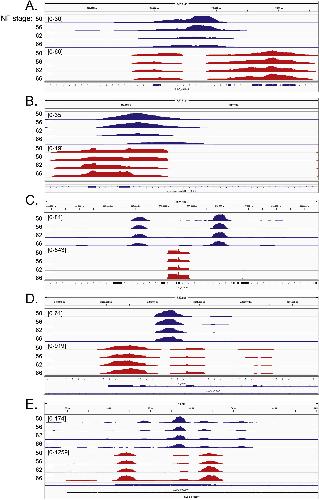 Supplemental Fig. 5. Five examples of the negative correlation between DNA methylation and gene transcription in tadpole brain during metamorphosis. Shown are screenshots of MethylCap-seq (blue) and RNA-seq (red) reads at discrete genomic regions at four stages of metamorphosis. Reads were mapped to the reference genome using the UCSD Genome Browser. NF stage â Nieuwkoop-Faber developmental stage. Numbers in brackets represent the peak height range. Gene IDs and symbols: (A) XLOC_001695; exd3, (B) new_exon_scaffold_1148_32; clasp1, (C) XLOC_022068; traf3, (D) XLOC_001221; msra.2, and (E) XLOC_000299.1; hipk3. |