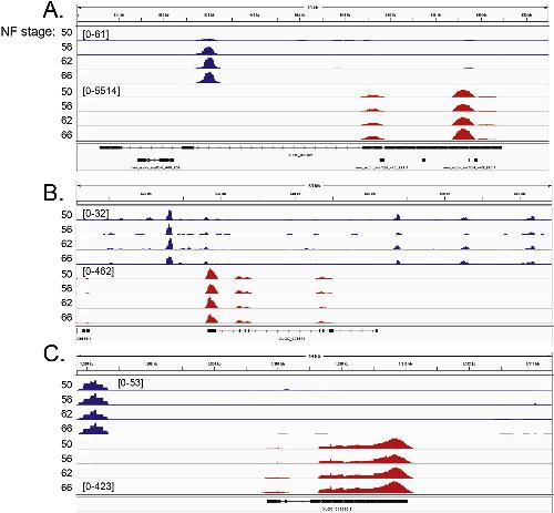 Supplemental Fig. 4. Representative methylation profiles in the X. tropicalis genome found by MethylCap-seq. Shown are IGV genome browser tracks for MethylCap-seq and RNA-seq reads at three loci of the X. tropicalis genome at four stages of metamorphosis (NF â Nieuwkoop-Faber). A. The nacc1 locus exhibited heavy methylation within exons and at an upstream region. B. The pnck locus exhibited methylation within introns and at an upstream region. C. The foxg1 locus exhibited no significant methylation. |