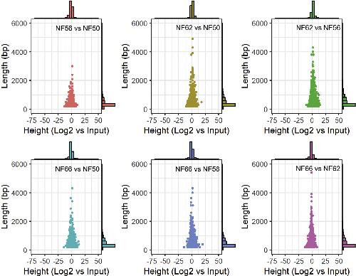 Supplemental Fig. 8. Comparisons of length and height of differentially methylated regions (DMRs) at six pairwise developmental stage comparisons. Shown are scatter plots with height (x-axis) and length (y-axis) of DMRs. Histograms showing the distribution of peak height and length are also shown. The DMR heights are log2 fold-height values of the first stage (A) relative to the second stage (B). For instance, a value of -2 means for a DMR in NF56 vs. NF50 means the DMR is log2-fold (or 4-fold) lower in NF56 than NF50, suggesting that demethylation occurred from NF50 to NF56 for that DMR. The lengths and heights of the DMRs are not very different between developmental stages; however, there is a shift in DMR height toward demethylation in the NF56 vs. NF50 comparison, methylation in the NF62 vs. NF56 comparison, and demethylation in the NF 66 vs. NF62 comparison as can be seen in the histograms at the top of each of these panels. |