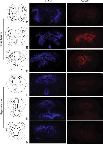 Supplemental Fig. 19. Distribution of 5-caC immunoreactivity in X. tropicalis brain at metamorphic climax. We conducted immunohistochemistry for 5-caC on 16 µm transverse sections of NF stage 62 X. tropicalis brain. Shown are representative images taken at 4X magnification; we analyzed three brains with similar results. Letters next to schematic diagrams represent the corresponding brain regions shown in Supplemental Fig 17. |