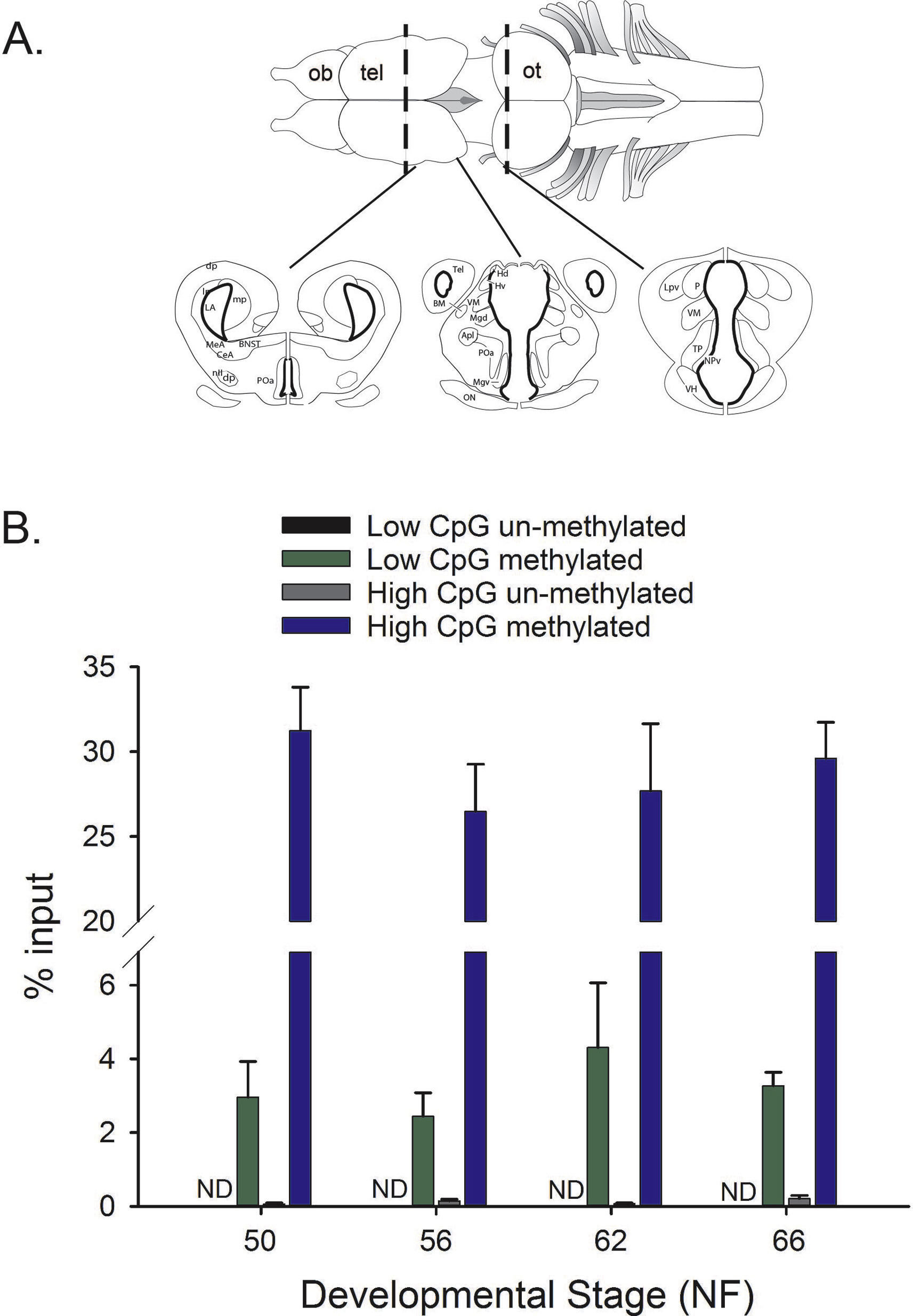 Supplemental Fig. 1. A. Region of the Xenopus brain dissected for RNA and genomic DNA extraction for RNA-seq and MethylCap-seq analyses, respectively. The anatomical diagrams are from Tuinhof et al. [1]; see Supplemental Fig. 17 and Supplemental Table 5 for complete neuroanatomy of Xenopus brain. B. The capture efficiency of methylated DNA was similar among samples. We measured the abundance of the spike-in control DNAs (generated by PCR amplification of different regions of lambda phage DNA that differed in their CpG content) in the high-salt fraction of the MethylCap procedure using real-time qPCR. The DNA fragments were purified, then subjected to in vitro methylation (or not) as described in the Materials and Methods. Low CpG un-methylated: lambda DNA fragment with a low density of CpG dinucleotides subjected to mock in vitro methylation; Low CpG methylated: lambda DNA fragment with a low density of CpG dinucleotides subjected to in vitro methylation; High CpG un-methylated: lambda DNA fragment with a high density of CpGs subjected to mock in vitro methylation; High CpG methylated: lambda DNA fragment with a high density of CpGs subjected to in vitro methylation. Bars represent the mean±SEM (n=4/developmental stage). |