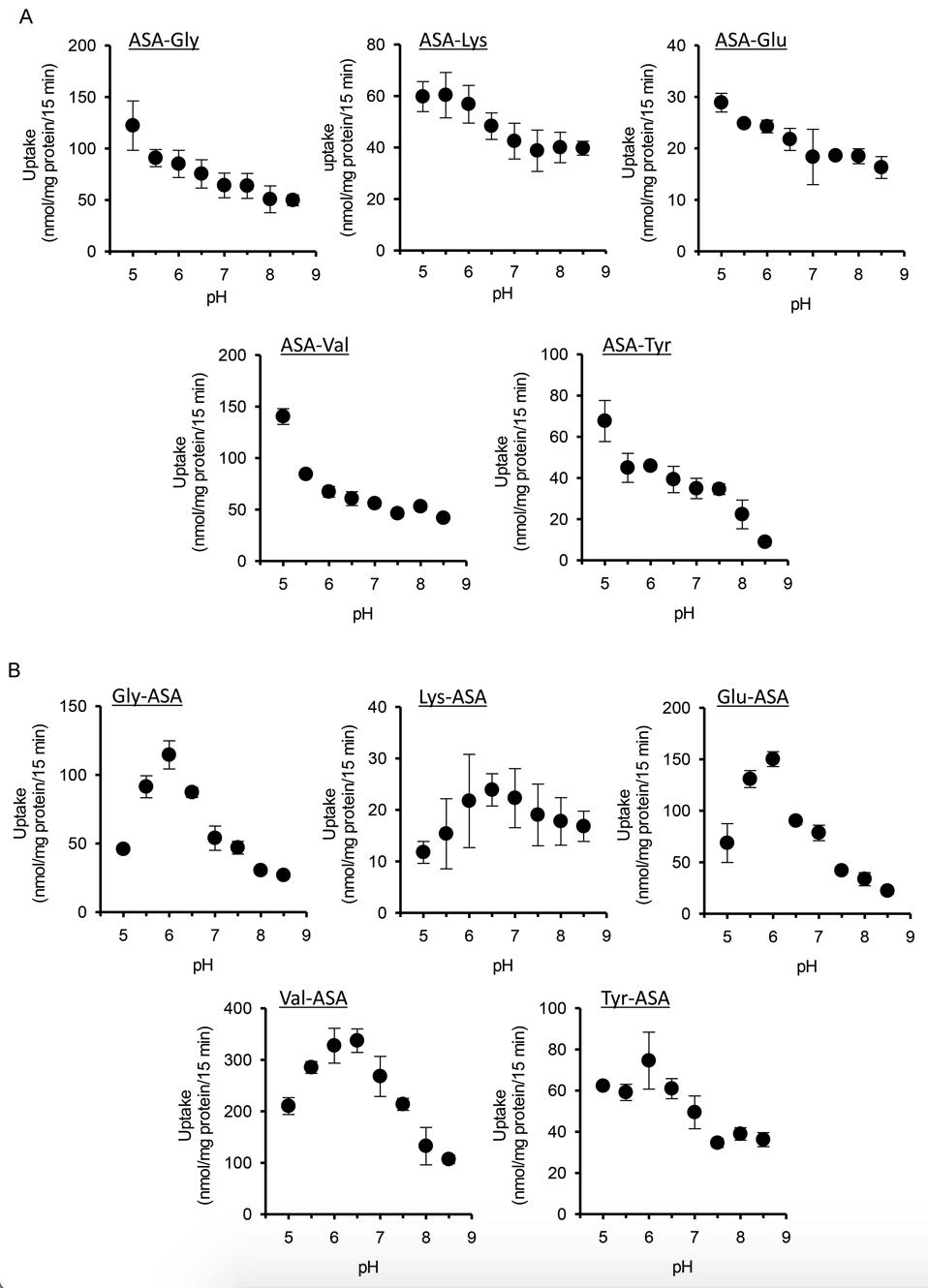 Uptake of (A) ASA-amino acid derivatives (1 mM) and (B) amino acid-ASA derivatives (1 mM) was measured in Caco-2 cells. The uptake was conducted for 15 min in the uptake buffers of varying pH. Values are mean ± S.D. (n = 4).