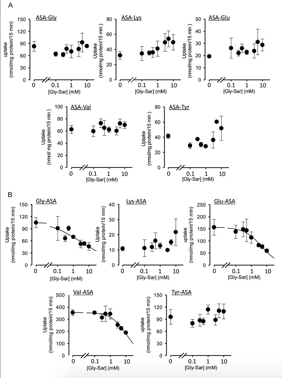Uptake of 1 mM ASA-amino acid derivatives (A) and amino acid-ASA derivatives (B) was measured with a 15-min incubation in the uptake buffer at pH 6.0 over a Gly-Sar concentration range of 0–10 mM. Each point represents mean ± S.D. (n = 4).