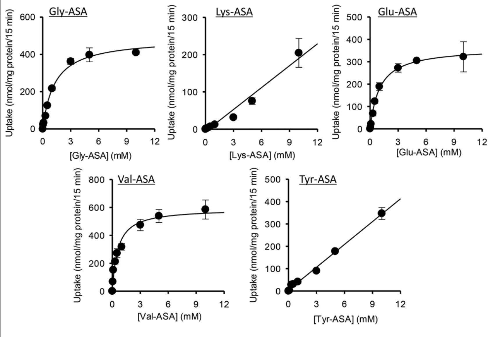Uptake of various amino acid-ASA derivatives was measured in Caco-2 cells with a 15-min incubation in the uptake buffer (pH 6.0) over their concentration range of 0.01–10 mM. Each point represents mean ± S.D. (n = 4).
