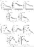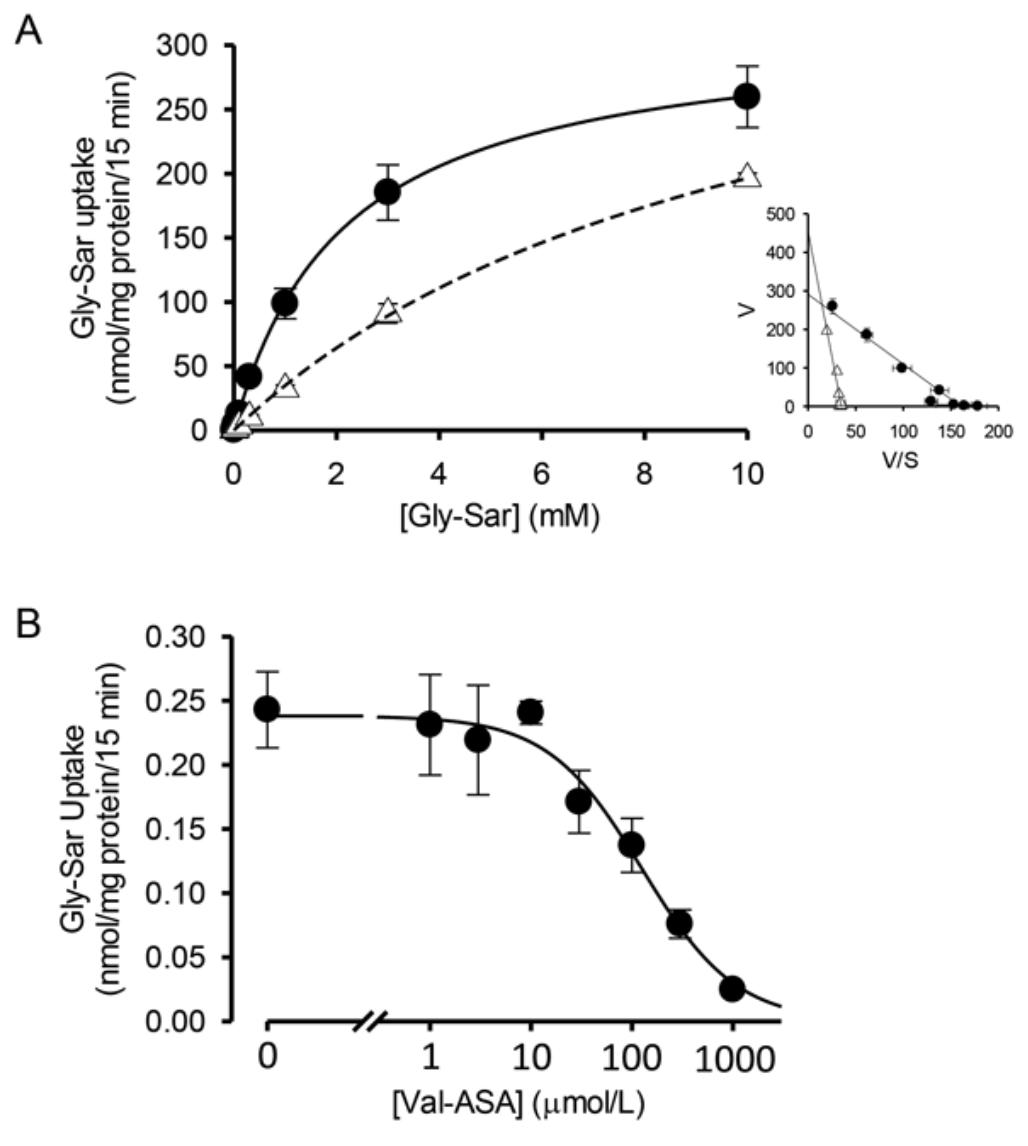 Uptake of [3H]Gly-Sar (0.06 µM radiolabeled plus 1 µM unlabeled Gly-Sar) was measured with a 15-min incubation in the uptake buffer (pH 6.0) over Val-ASA concentration range of 0–10 mM (A). The uptake of Gly-Sar was measured with a 15-min incubation in the uptake buffer (pH 6.0) (B). The concentration of Gly-Sar ranged between 0.06–10 mM in the presence (△) or absence (●) of 0.5 mM Val-ASA. Inset: Eadie-Hofstee plot analysis of data. Lines were fitted by using linear-regression analysis. Results are mean ± S.D. (n = 4).