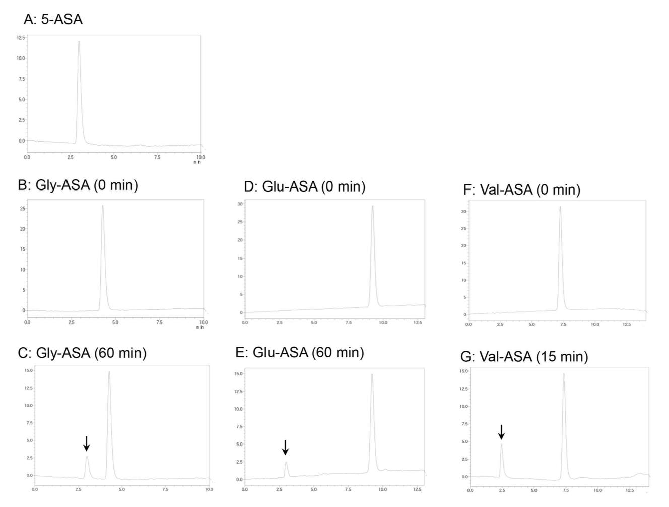 Supplementary figure 1- HPLC analysis of the degradation property of 5-ASA derivatives in Caco-2 cell homogenate. Chromatograms of 5-ASA (A), Gly-ASA (B,C), Glu-ASA (D,E), and Val-ASA (F,G). The 5-ASA derivatives (10 microM) were incubated with an equal volume of Caco-2 cell homogenate (1 mg protein/mL) for predetermined time (Gly-ASA and Glu-ASA: 60 min, Val-ASA: 15 min) at 37 degrees C under shaking conditions (120 rpm). HPLC analysis of the derivatives was performed before (B,D,F) and after (C,E,G) the incubation. Arrows indicate the peak derived from 5-ASA.