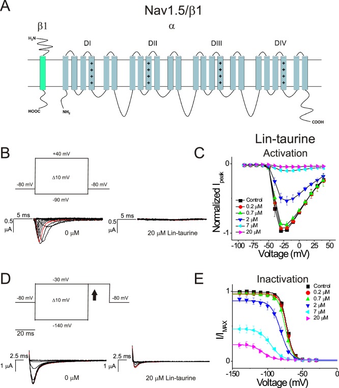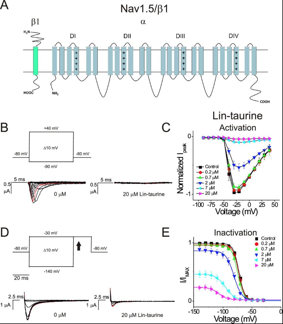 Figure 3. PUFA analogue, Linoleoyl-taurine, inhibits Nav1.5/β1 by shifting the voltage dependence of inactivation.(A) Simplified membrane topology of the Nav1.5 pore-forming α-subunit (light blue) and auxiliary β-subunit (green). (B) Voltage protocol used to measure voltage dependence of activation and representative Nav1.5/β1 current traces in control (0 μM) and 20 μM Lin-taurine. (C) Current-voltage relationship demonstrating dose-dependent inhibition of Nav1.5/β1 currents measured from activation protocol (mean ± SEM; n = 5). (D) Voltage protocol used to measure voltage dependence of inactivation and representative Nav1.5/β1 current traces in control (0 μM) and 20 μM Lin-taurine measured at arrow. (E) Current-voltage relationship demonstrating dose-dependent inhibition of Nav1.5/β1 currents and leftward shift in the voltage dependence of inactivation measured from inactivation protocol (mean ± SEM; n = 5). |