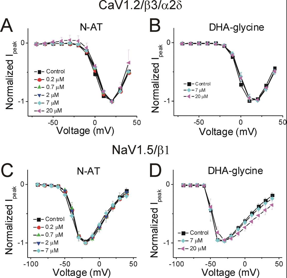 Supplementary figure 4- PUFA-induced changes in I/I0 normalized by concentration show no changes in voltage-dependent activation of Cav1.2/β3/α2δ and Nav1.5/β1 channels. (AâB) Voltage-dependent activation of Cav1.2/β3/α2δ in the presence of (A) N-AT (n = 3) and (B) DHA-glycine (n = 3). Peak currents are normalized to each concentration to clearly visualize that there is no shifts in voltage-dependent activation. (CâD) Voltage-dependent activation of Nav1.5/β1 in the presence of (C) N-AT (n = 3) and (D) DHA-glycine (n = 7). Peak currents are normalized to each concentration to clearly visualize that there are no shifts in voltage-dependent activation. |